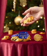 A flatlay with the Divine fairtrade milk chocolate coins inside the yellow netted bag and other coins scattered with a blue festive inspired background. Chocolate coins available at Babipur.