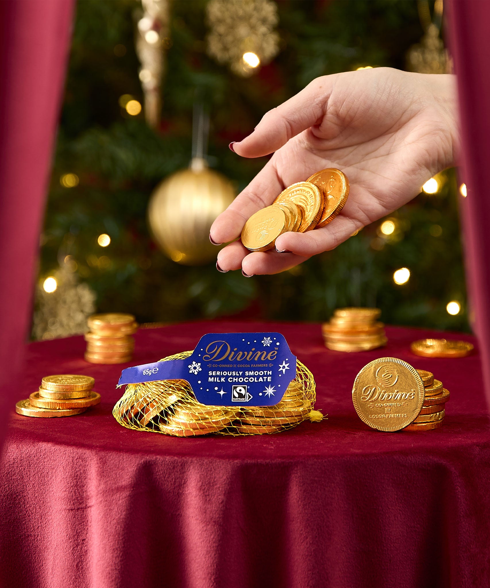 A stack of Divine fairtrade milk chocolate coins against a Christmas present. Coins available at Babipur.