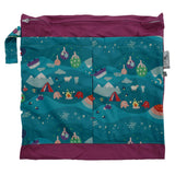 The Pop-in Dan y Sêr print waterproof wet bag with zip closure and two compartments. Dan y Sêr translates to 'under the stars' and encapsulates our love of the outdoors, spending family nights camping under starry skies. Featuring a Snowdonia nighttime campfire theme with elephants roasting marshmallows surrounded by the mountains.