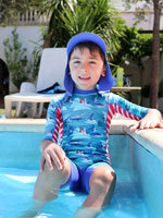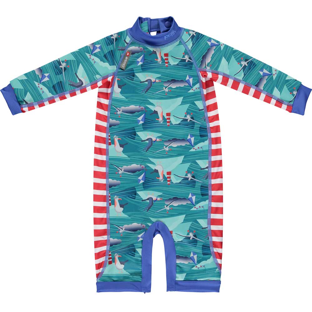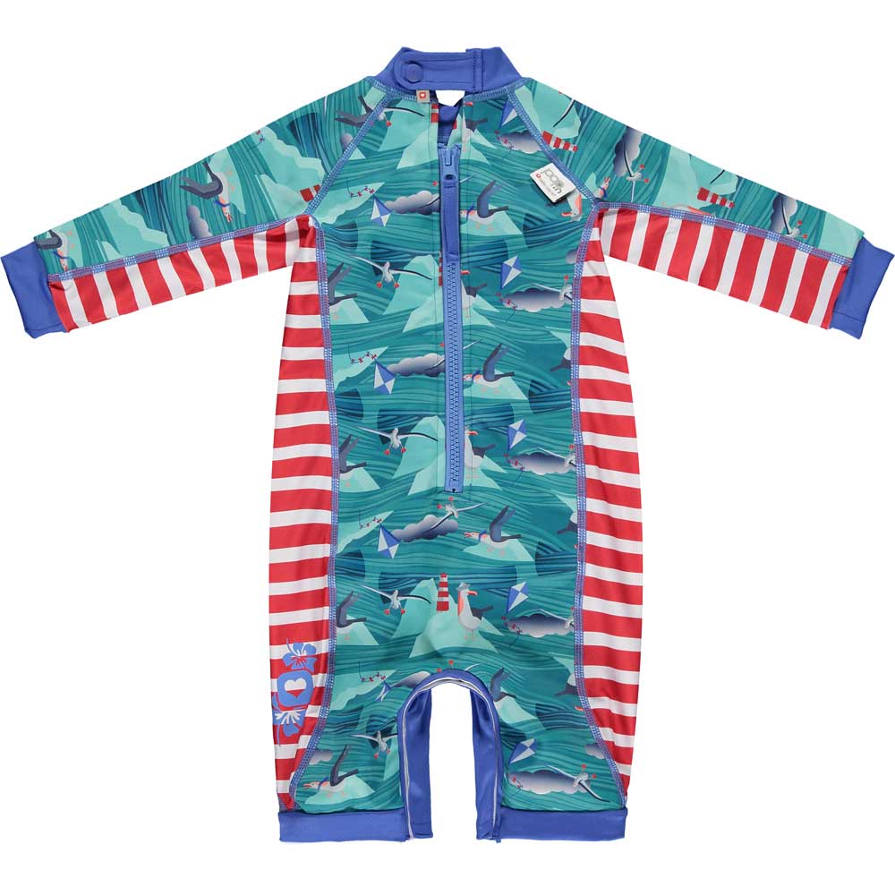 Getting it on is easy - there's a zip at the back and popper at the neck, and sizes medium-extra large have poppers at the crotch to allow for speedy nappy changes or trips to the loo. Wear over a Pop-In Swim Nappy if your child hasn't yet potty trained. Sizes 2XL and 3XL have fixed legs. The fleece layer inside will keep tots warm and the gorgeous 3-ply print outer is sun-safe and stain-resistant too - handy for any sun cream spills or melted ice cream. Rinse immediately after use and wash with coloured clothing or nappies.