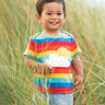 Frugi blue tractor applique rainbow striped t-shirt. Bands of red, light yellow, green, orange and light blue in-between thinner white stripes.