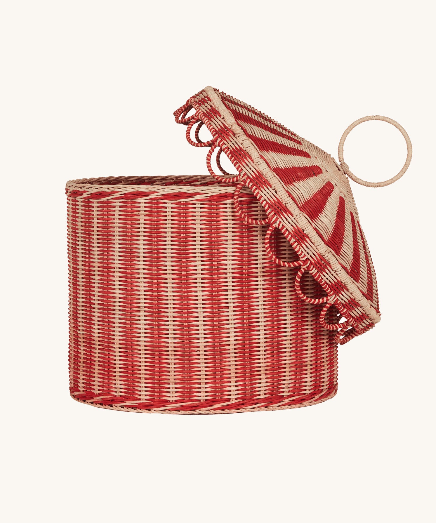 An Olli Ella Red & Straw Rattan Circus Tent Basket shown with the top lifted off and balanced on the side. This large capacity basket is perfect for use as toy storage. Olli Ella have a range of stylish storage solutions and soft toys available here at Babipur.