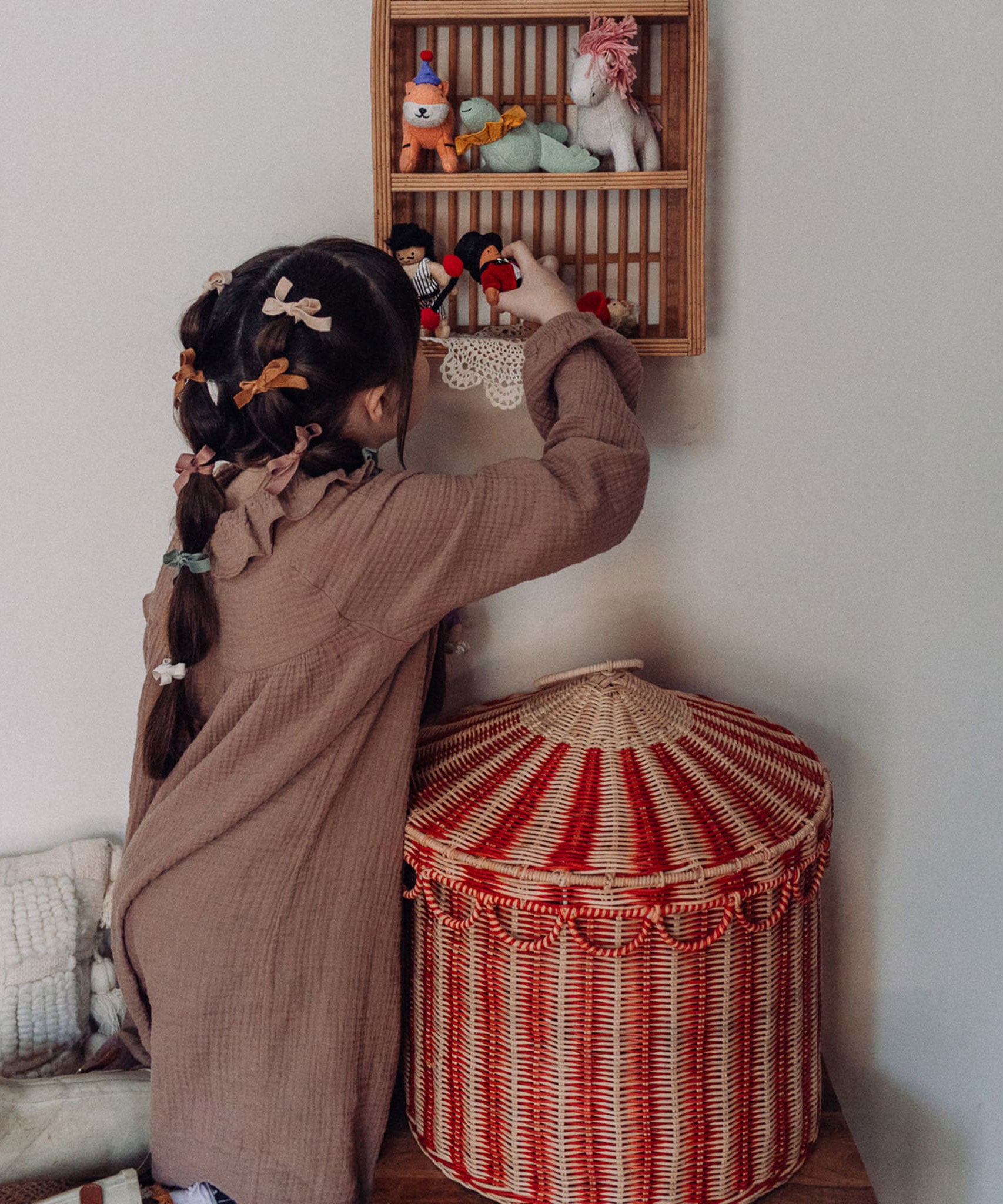 A child placing toys on a wooden display shelf. An Olli Ella Red & Straw Rattan Circus Tent Basket can be seen underneath. This large capacity basket is perfect for use as toy storage. Olli Ella have a range of stylish storage solutions and soft toys available here at Babipur.