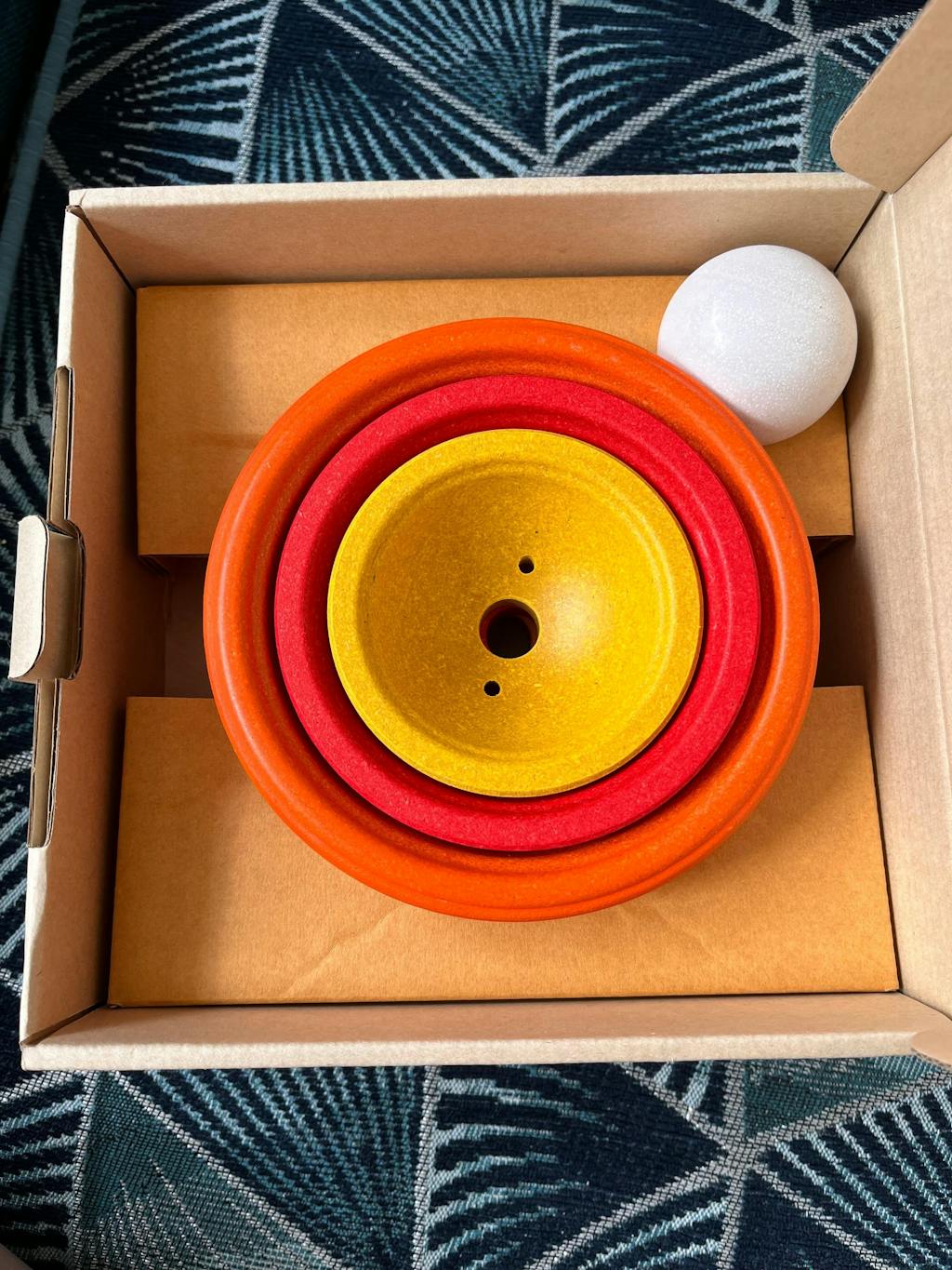 The PlanToys Chicken Nesting toy is a fun, cute and colourful stacking toy for little ones. The set comes with 3 stacking bowls with an adorable chicken face on the front, and an egg to be balanced on top. The chicken bowls are orange, red and yellow.