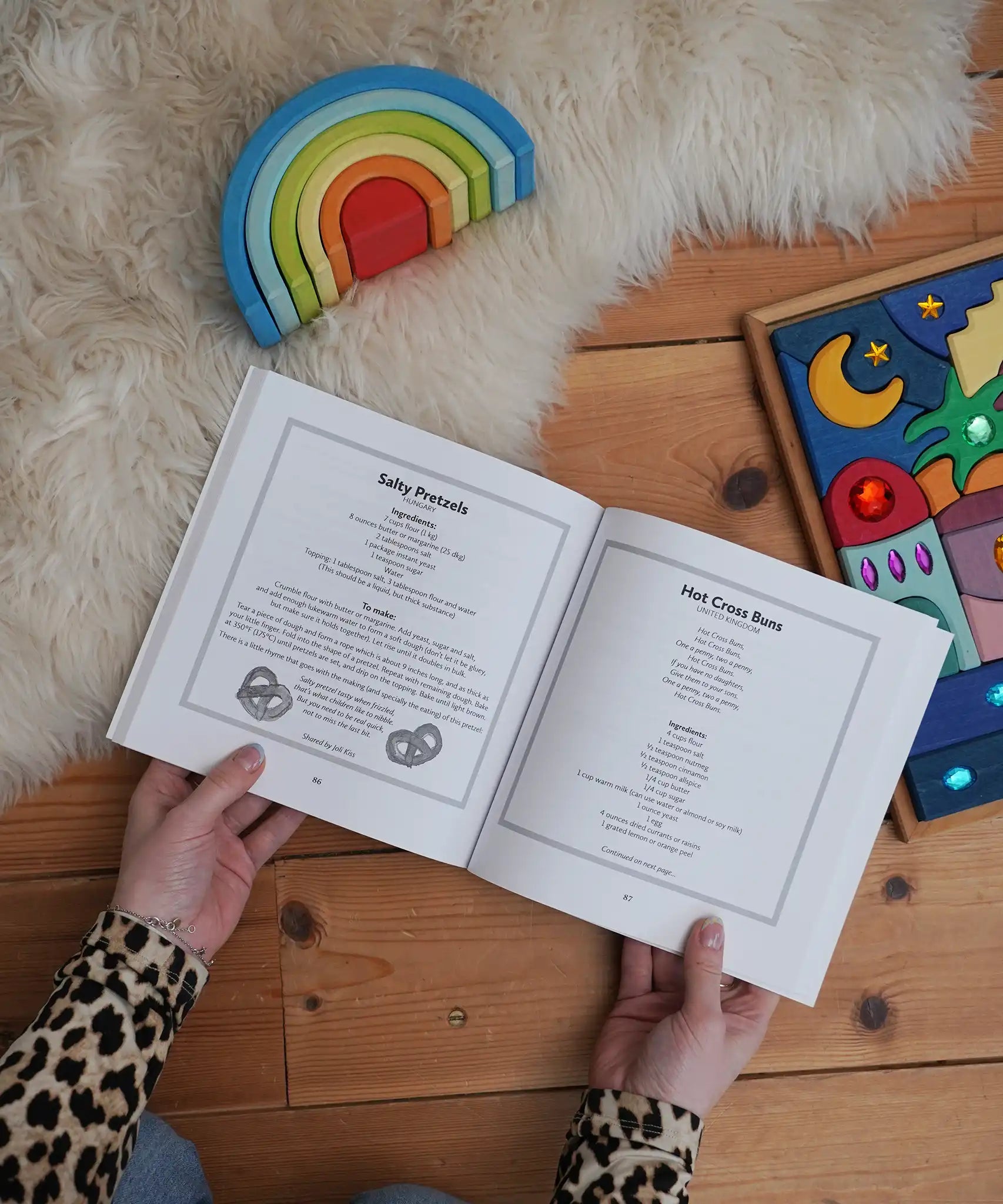 For The Children Of The World children's book by Louise deForest showing the recipe pages open in an adult's hands in the Bbaipur playroom. Grimm's wooden Babi Gwawr rainbow and sparkling orient set placed on the floor.