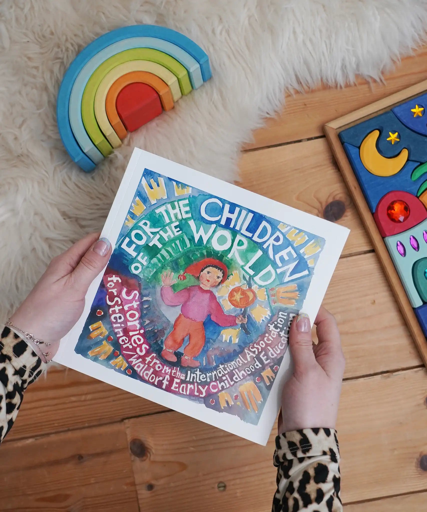 For The Children Of The World children's book by Louise deForest showing the Steiner Waldorf story pages shown open in an adult's hands in the Babipur playroom. Grimm's wooden Babi Gwawr rainbow and sparkling orient set placed on the floor.