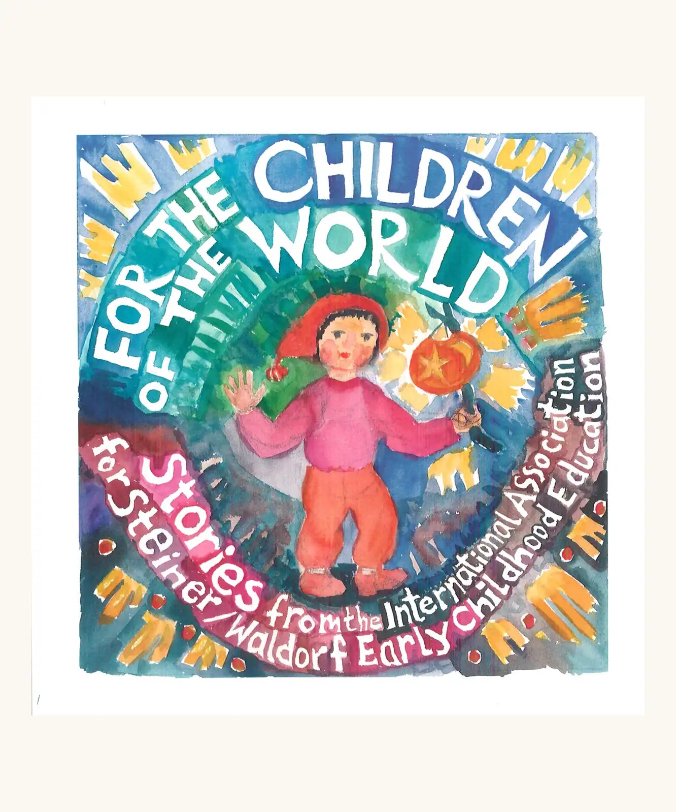 For The Children Of The World by Louise deForest, book cover featuring a water colour image of a child with a colourful patter and writing around the child in the middle of the image. The writing says "For The Children of The World. Stories from the international association for Steiner/Waldorf Early Childhood Education"