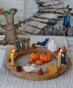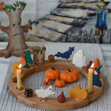 A Grimm's natural celebration ring decorated with Autumn and Halloween themed figures and wooden toys. A Bumbu tree can be seen in the background with a Wonderie trick or treat play cloth hung on the wall behind.