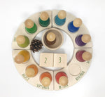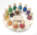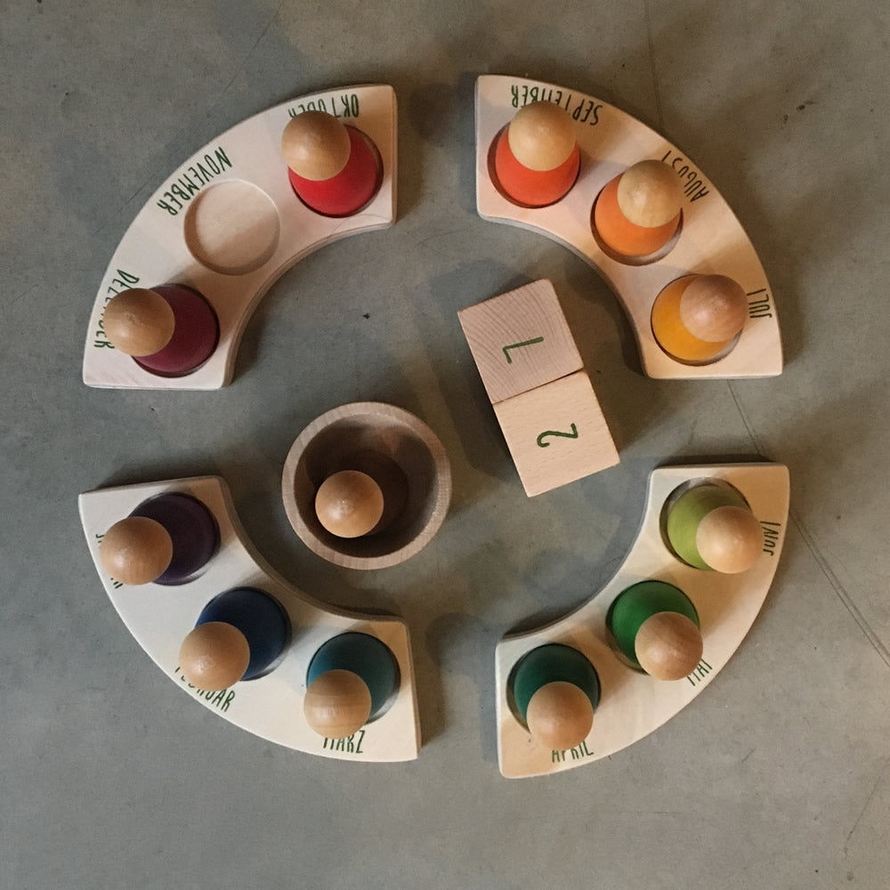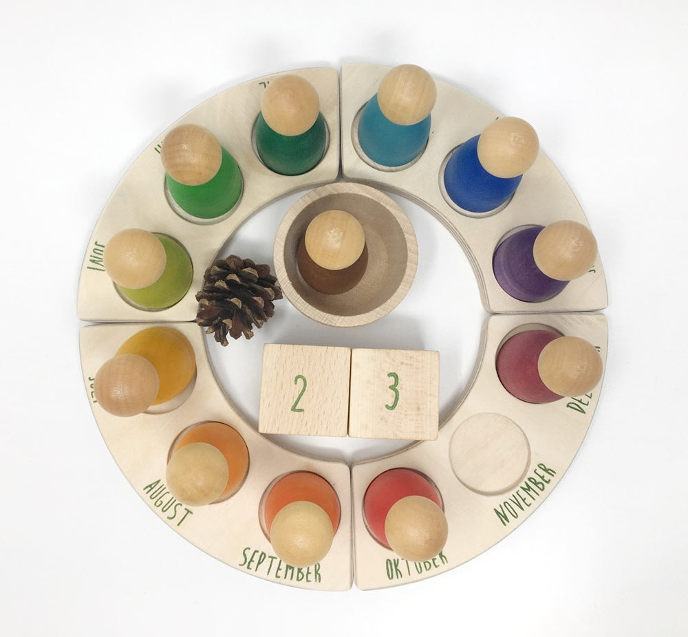 Each coloured Nin or peg doll figure represents a month of the year according to Waldorf teachings. Along with the wooden cube the day of the month and the month of the year can be displayed in German. This gives children a physical reference point that they can use to touch the day with and develop and understanding of the passing of time. This is a beautiful tactile piece that can also be used for play and makes a great gift for German speakers and learners.