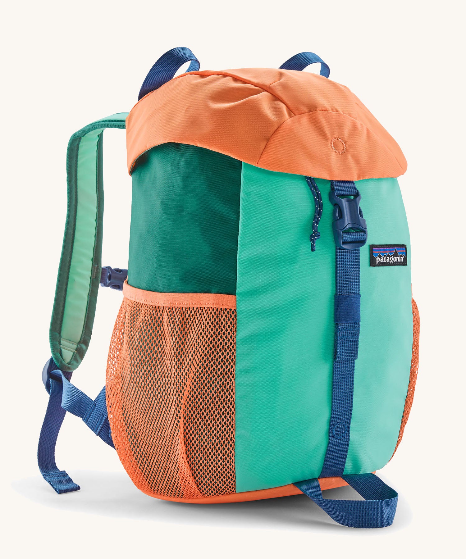 Patagonia kids refugito 12L day pack in green and pale orange block colour. Shows front buckle lid fastener and mesh pockets