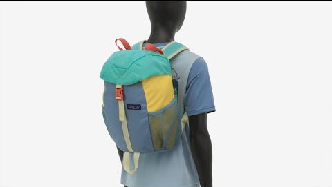 Patagonia kids refugito 12L day pack in green and pale orange block colour. Shows blue shoulder straps and orange back panel