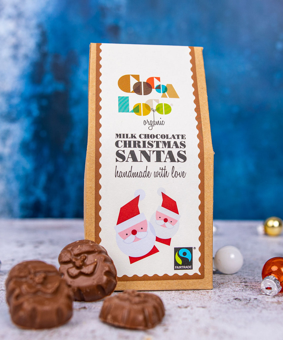 A pack of Cocoa Milk Chocolate Santas. These Chrimas Santa shaped santas are made with UPF free, organic and Fairtrade chocolates.