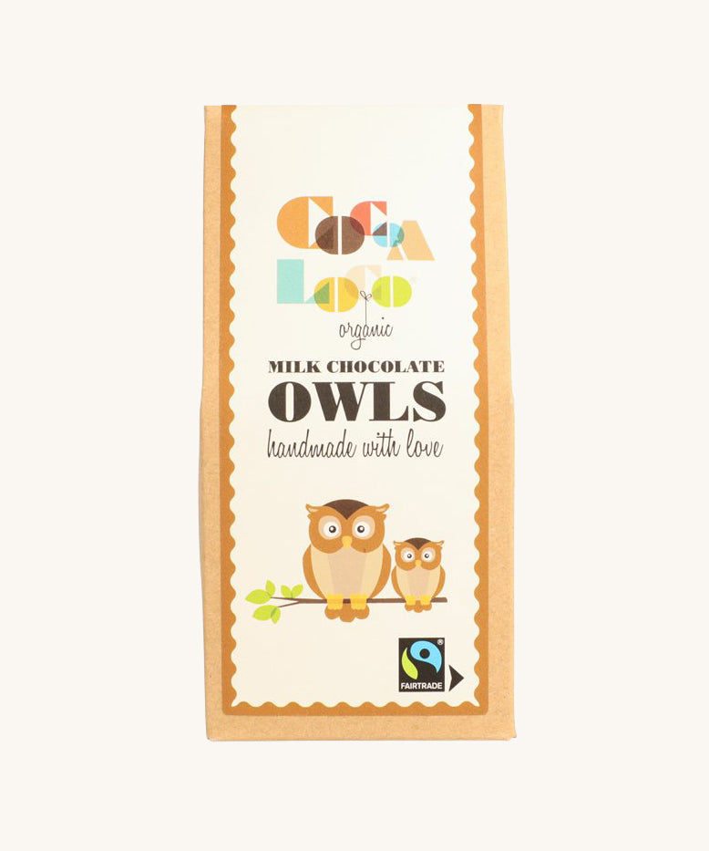 Cocoa Loco Milk Chocolate Owls. UPF free, organic, Fairtrade milk chocolates shaped like owls.