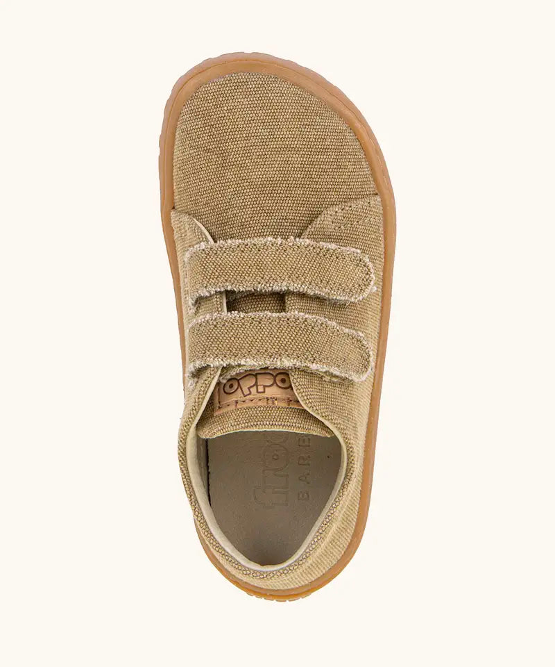 Froddo barefoot botaniq kids canvas stye shoes in beige shows velcro straps looped through the eyelets and a brown grippy sole