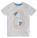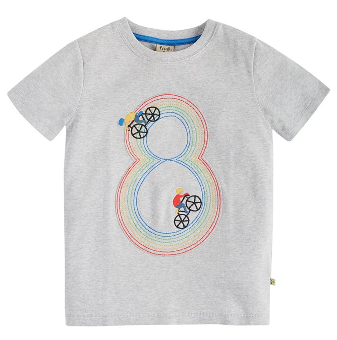 Hip-Hip Hooray! Celebrate your little one’s Birthday with this colourful Frugi Magic Number T-shirt with a fun applique of your favourite Frugi characters disguised as your child’s age – a grey marl organic cotton short-sleeved children’s top with a colourful rainbow bike track in the shape of the number 8.