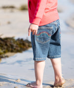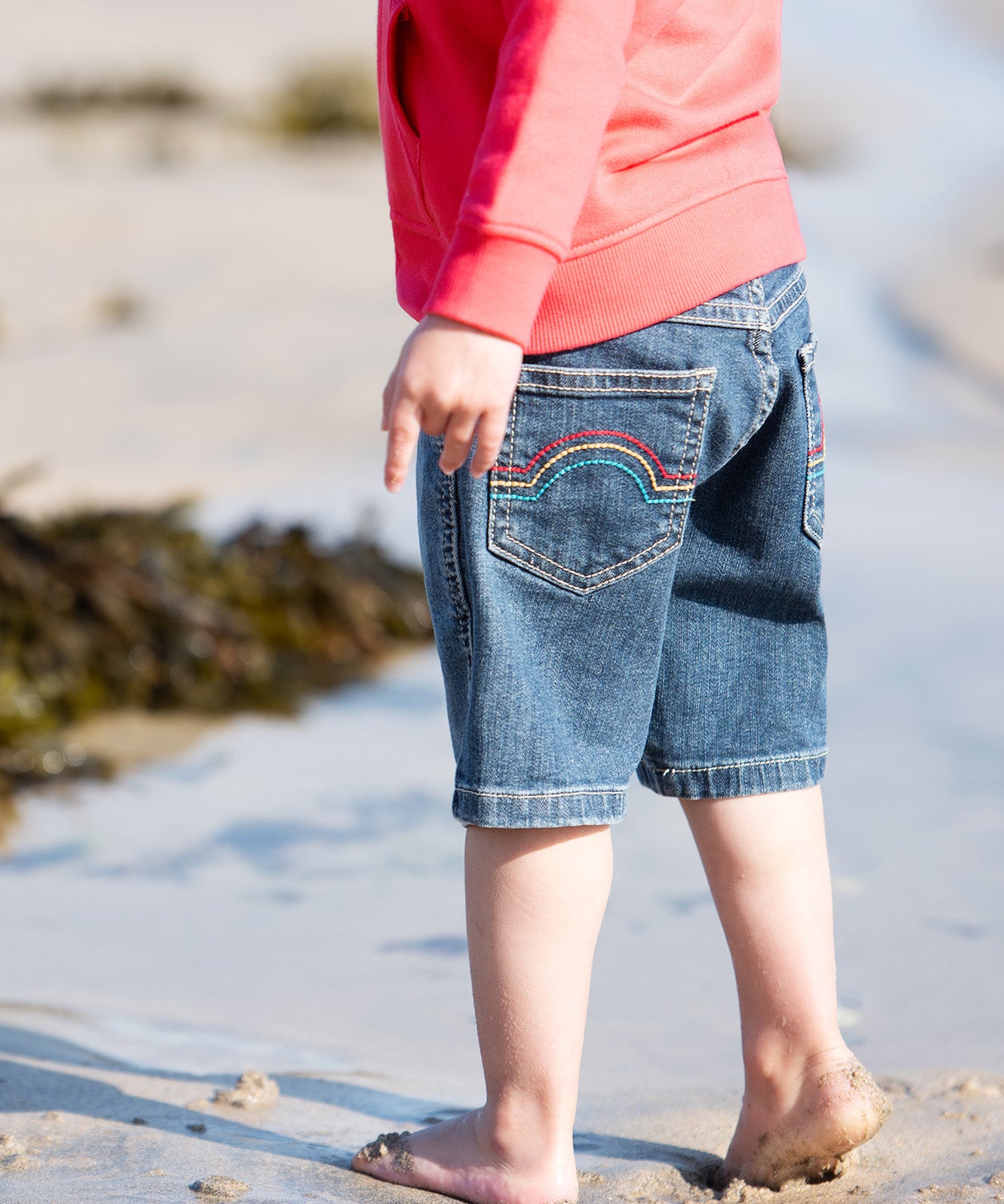 These Frugi Dorian denim shorts are made from 98% GOTS certified organic cotton mid-wash denim with 2% stretchy elastane - perfect for exploring in comfort! With a rainbow elasticated waist for easy dressing in the mornings and cotton drawstring for adjusting to fit your child, these shorts are super soft, extra delicate on sensitive skin and are eczema-friendly too. Simply dress up with either Frugi Over the Rainbow 4 pack body, or with a Bobster applique tshirt or any jumper for a stylish eco-friendly outfit!