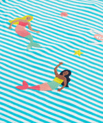 A close up of Frugi Ennis Embroidered T-Shirt in Moss Stripe featuring embroidered  swimming Mermaids.
