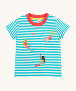 Dive into deep sea adventure with the Frugi organic Ennis top, featuring adorable embroidered mermaid designs on a stripy blue background. This kids' t-shirt has short sleeves and nickel-free popper fastenings at the shoulder on sizes up to 4 years for easy dressing.