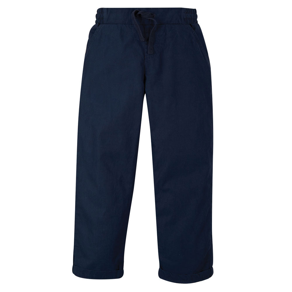 These Frugi Indigo Everywhere Trousers for children are indigo blue smart casual organic cotton woven chinos with a comfortable elasticated waistband, functional drawcord and practical side pockets.