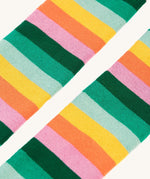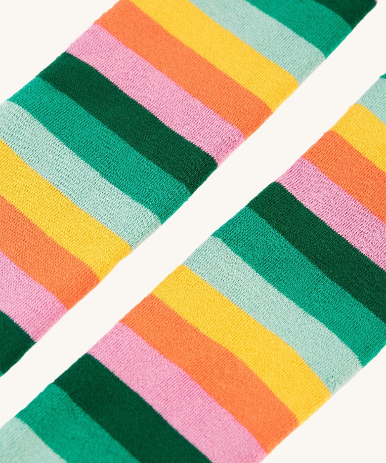 These knitted organic cotton Toasty Tights from Frugi are perfect for keeping little legs warm on colder days! Layer these kids' tights under a skirt or dress for the perfect autumnal look when it starts getting colder. In a multicoloured Cantaloupe Stripe with contrasting heels and toes, these stripy tights are made with a touch of stretchy elastane to help with durability and add some extra comfy stretch.