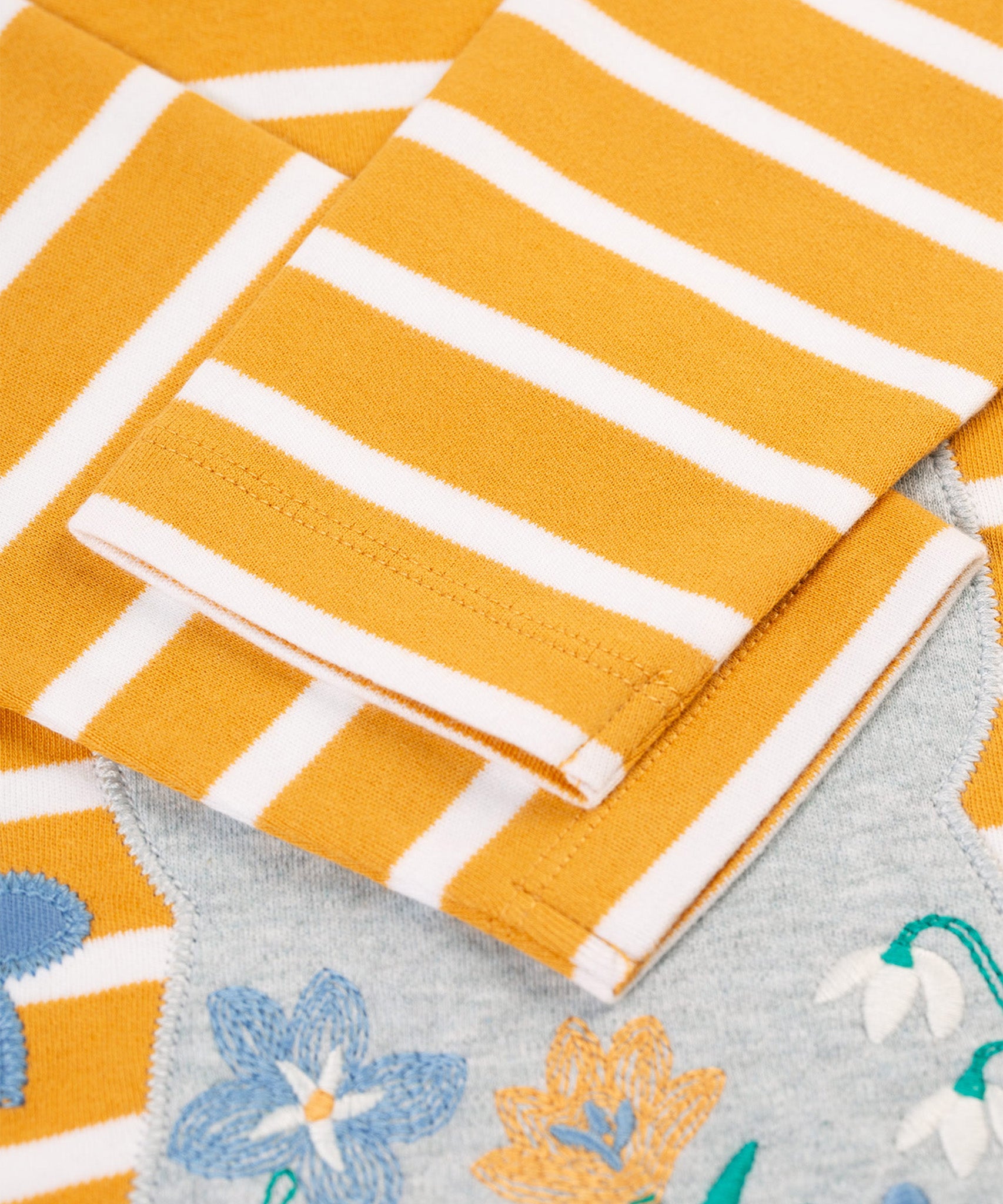 This organic cotton long-sleeved Tori Appliqué Top from Frugi comes in a Gold Breton Stripe with a cute cat appliqué on the front. Made from soft organic cotton, this kids' top has dropped shoulders, and poppers on the shoulder of sizes up to 4 years to help make dressing easier.