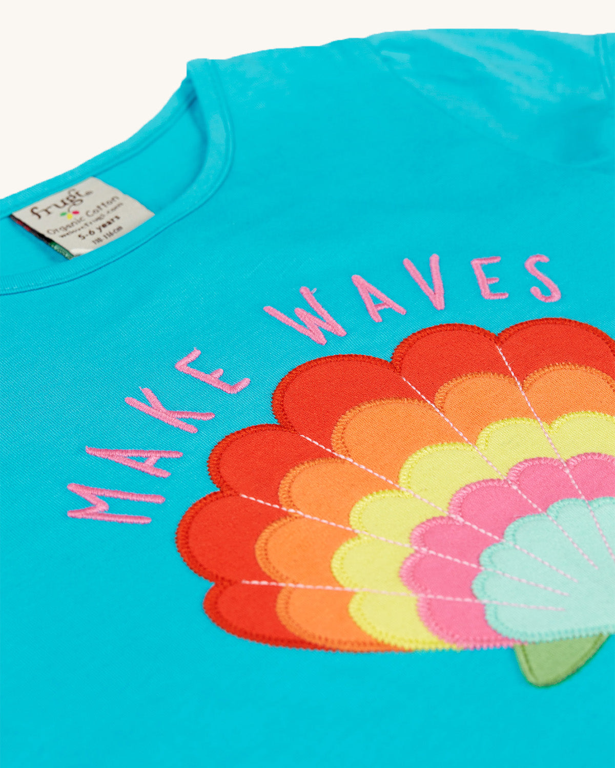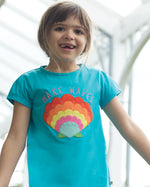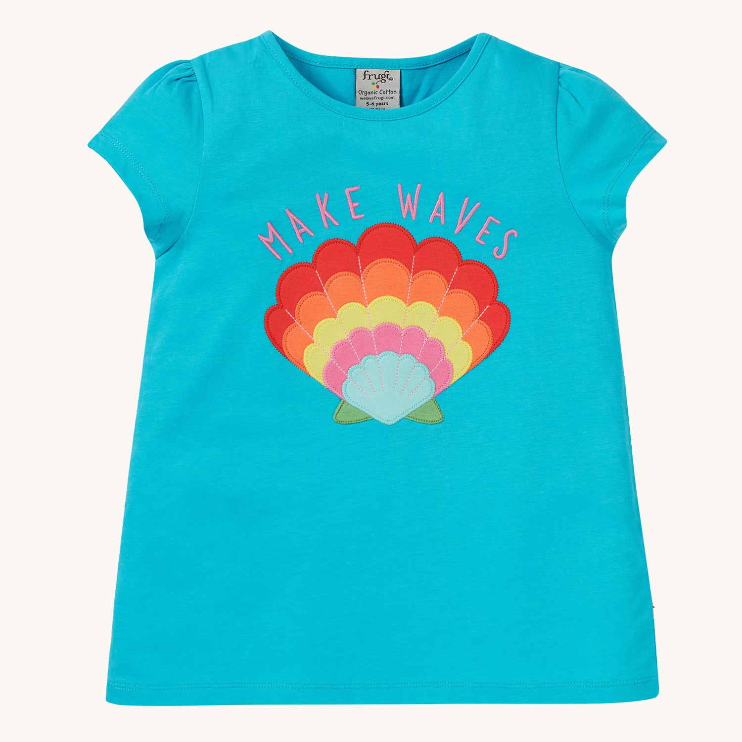 In a gorgeous Tropical Sea blue, this organic cotton Frugi T-Shirt features a seashell applique, and a ‘Make Waves’ slogan. This soft tee is perfect for sunny beach days, and comfy for every-day play.
