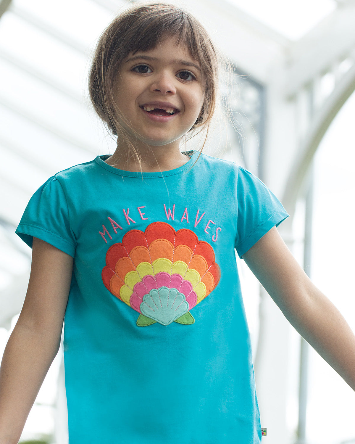 The Frugi Cassia Applique T-Shirt is a short-sleeved top featuring a colourful clamshell applique design, and the slogan ‘Make Waves’ sewed in a pink font. This is a longer length A-line t-shirt, and has gathered sleeves. Made from GOTS Certified organic cotton, this cute tee is soft and comfy on children’s skin, and is eczema-friendly and gentle on sensitive skin. Match this tee with a pair of shorts for a sunny beach look, or with some soft organic leggings when the breeze picks up. Lightweight and layerable, this t-shirt is a year-round staple for organic, eco-friendly, and Fair Trade outfits.
