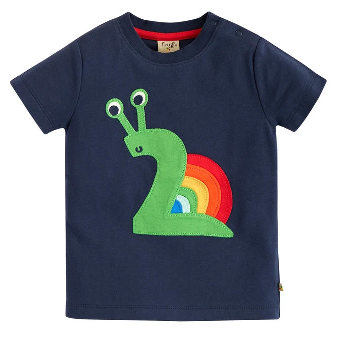 Hip-Hip Hooray! Celebrate your little one’s Birthday with this colourful Frugi Magic Number T-shirt with a fun applique of your favourite Frugi characters disguised as your child’s age – an indigo blue organic cotton short-sleeved children’s top with a cute Snail with a rainbow shell in the shape of the number 2.