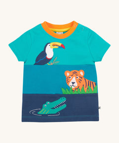 A child wearing the Frugi Canopy Land Sea Penryn Panel T-shirt with Frugi sea moss stripe Sunny Shorts.