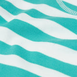 Close up of the Frugi kids sunny sea moss short - showing the blue and white stripe print on organic cotton fabric