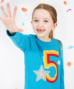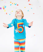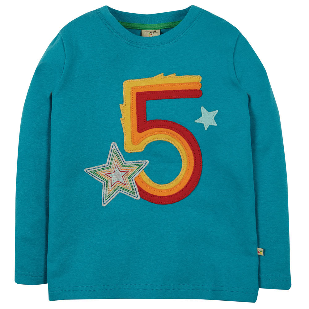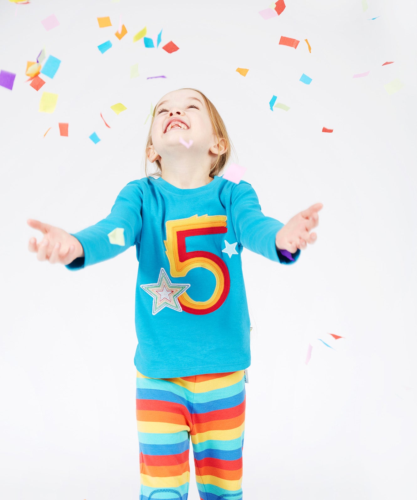 Hip-Hip Hooray! Celebrate your little one’s Birthday with this colourful Frugi Magic Number Top with a fun applique of your favourite Frugi characters disguised as your child’s age – a teal blue organic cotton long-sleeved children’s top with a colourfil shooting star in the shape of the number 5.