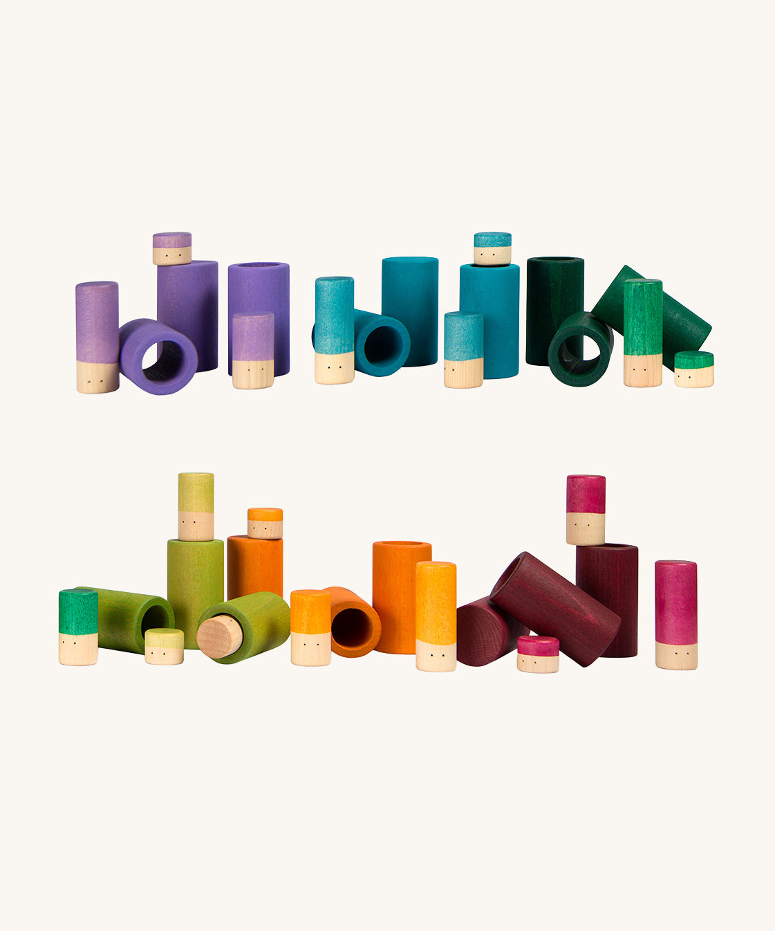 The Grapat LA set contains 36 wooden pieces painted in 6 different rainbow shades. This wooden play set by Grapat is a remix of the much loved large Lola set, a wonderful toy for open-ended play. The LA set includes a mixture of cylindrical playing parts, little characters (lola) in various heights with little eyes, tubes, solid cylinders and half tubes. The Lola pieces slot inside the colourful tubes and half tubes. Check out the Grapat LO set in a range of bright rainbow colours.
