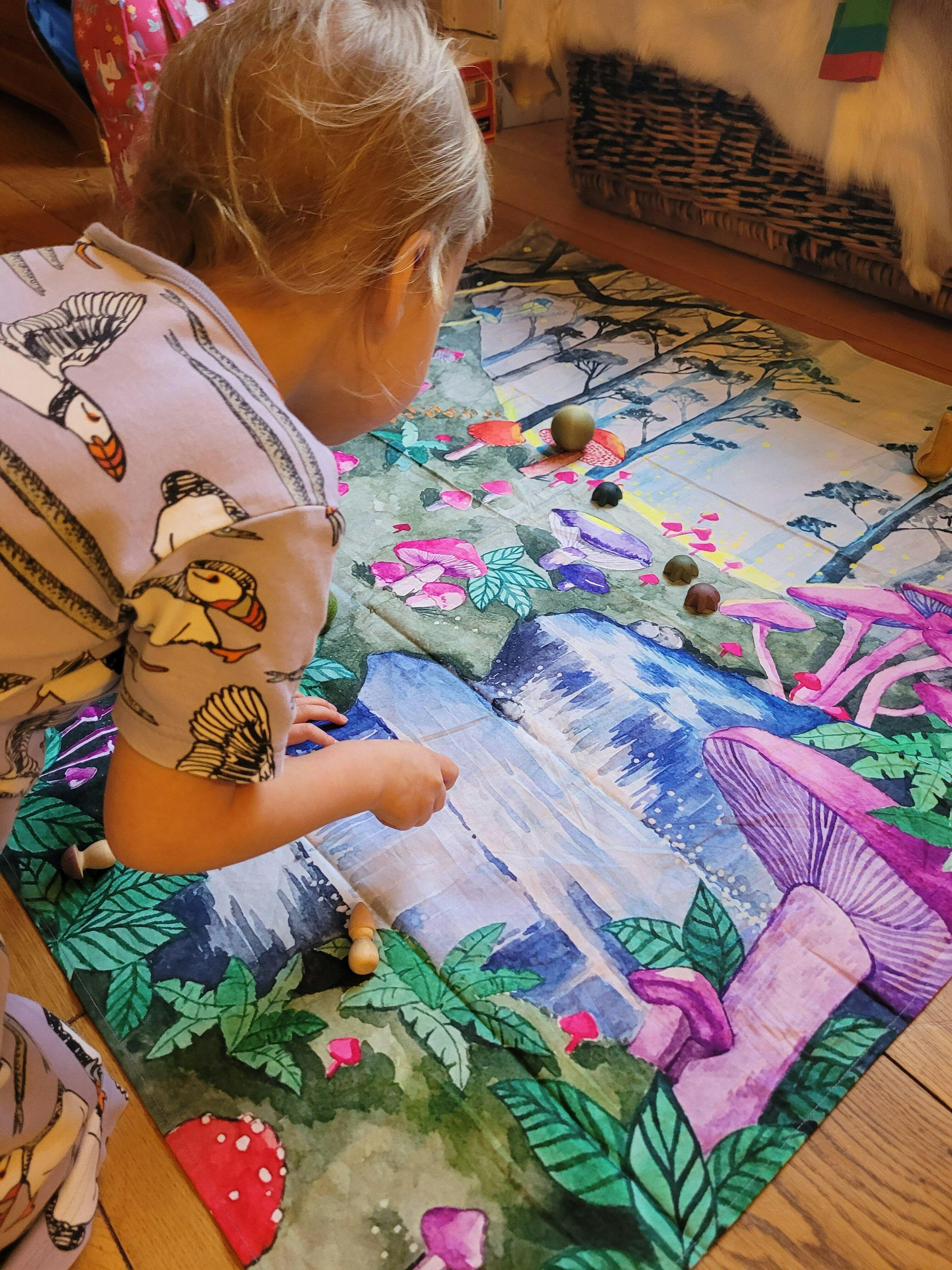 A child playing with three pieces from the Grapat Moonlight Tale Play Set. Various handmade and hand painted wooden figures of mushrooms.