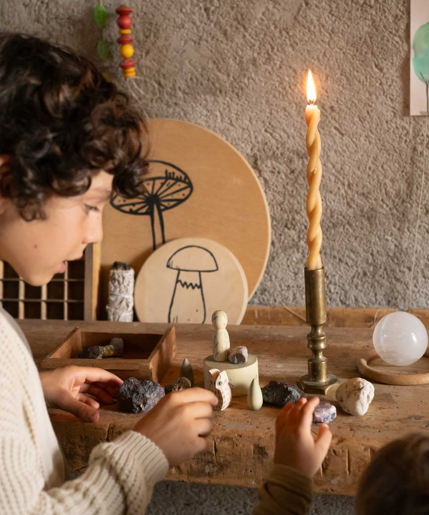 The Grapat Ostheimer Limited Edition Hello Winter wooden toy set available at Babipur. Features 5 hand cut and hand painted figures and pieces including a peg doll, small decorative bowl, owl and 2 green coloured snowdrop mandala pieces. The pieces from the set have been placed on a wooden surface and surrounded by bit of rocks and crystals. Two children are standing in front of them reaching for some of the pieces.