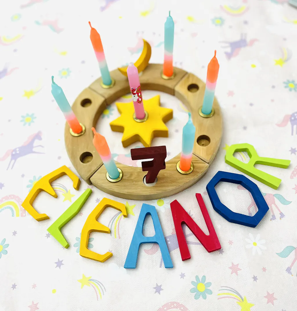 Celebrate birthdays, family occasions, Christmas and other religious and cultural events with these fabulous celebration rings and spirals by Grimm’s. Slot in candles and colourful numbers, letters and characters into the holes that are relevant to the special event and can be used as a discussion point for your family. For each birthday, add a candle and a new personalised ornament and, as the years pass and the slots become filled with candles, move the ornaments into the centre. You needn’t hide your Grimm’s celebration ring away, only bringing it out for parties: these traditional decorations can also be used throughout the year as a centre piece on your dinner table. Twelve-hole rings can be used to mark each passing month, and seven-hole rings can be used to count down to the weekend.