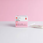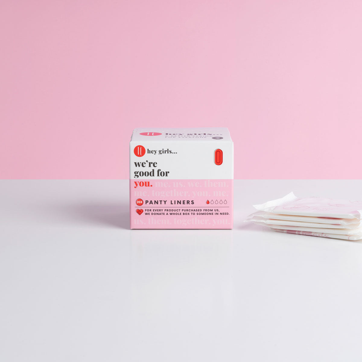 Hey Girls Natural Bamboo & Corn Fibre Disposable Panty Liners laid flat on a red and pink background