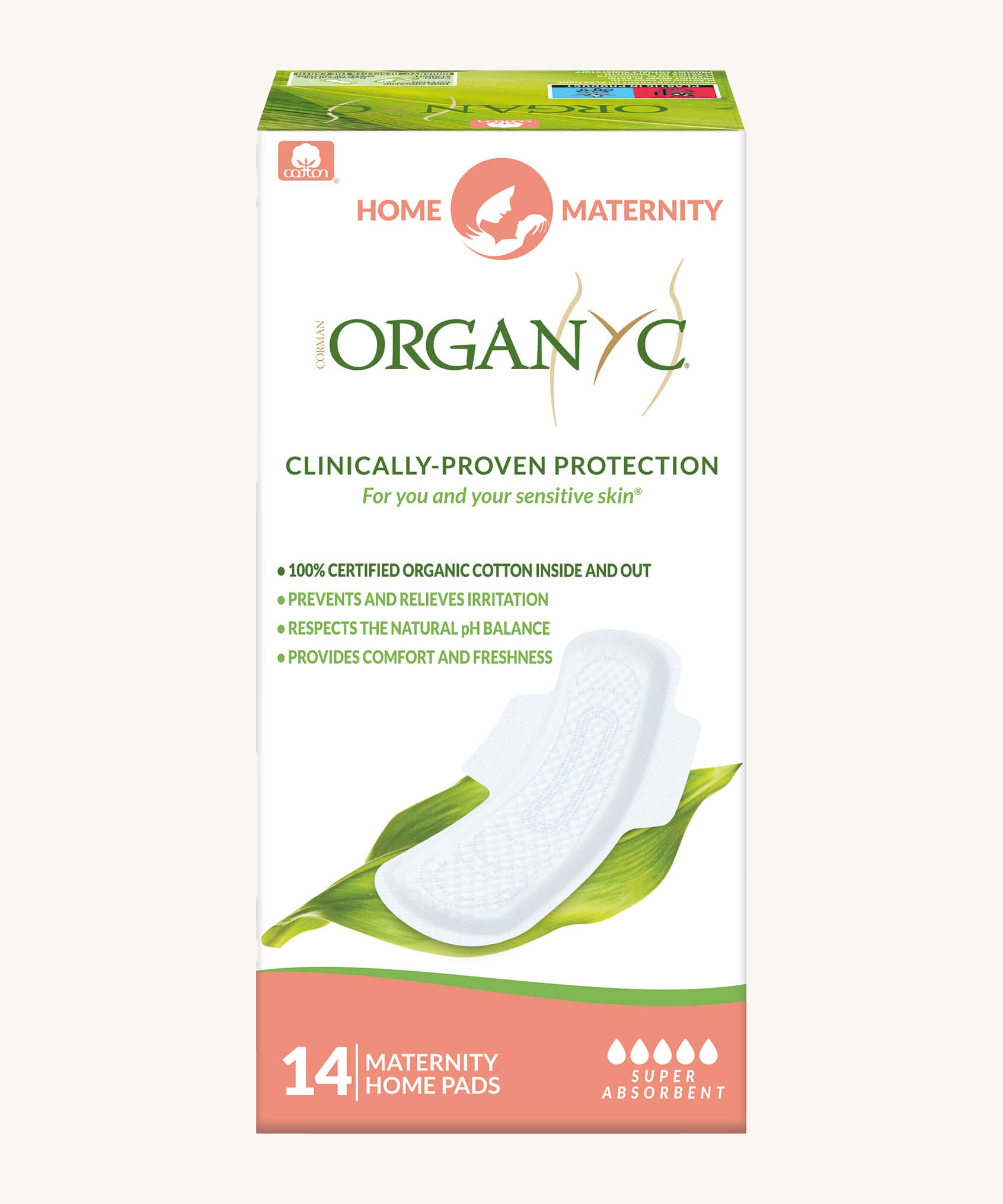Organyc 14 Home Maternity Pads in their box on a plain background.