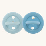 Hevea Bumibebe natural rubber round dummies in blue on a beige background