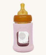 Hevea Glass Baby Bottle Wide Neck With Rubber Sleeve - 150ml in Powder Pink on a white furry rug and floral muslin.