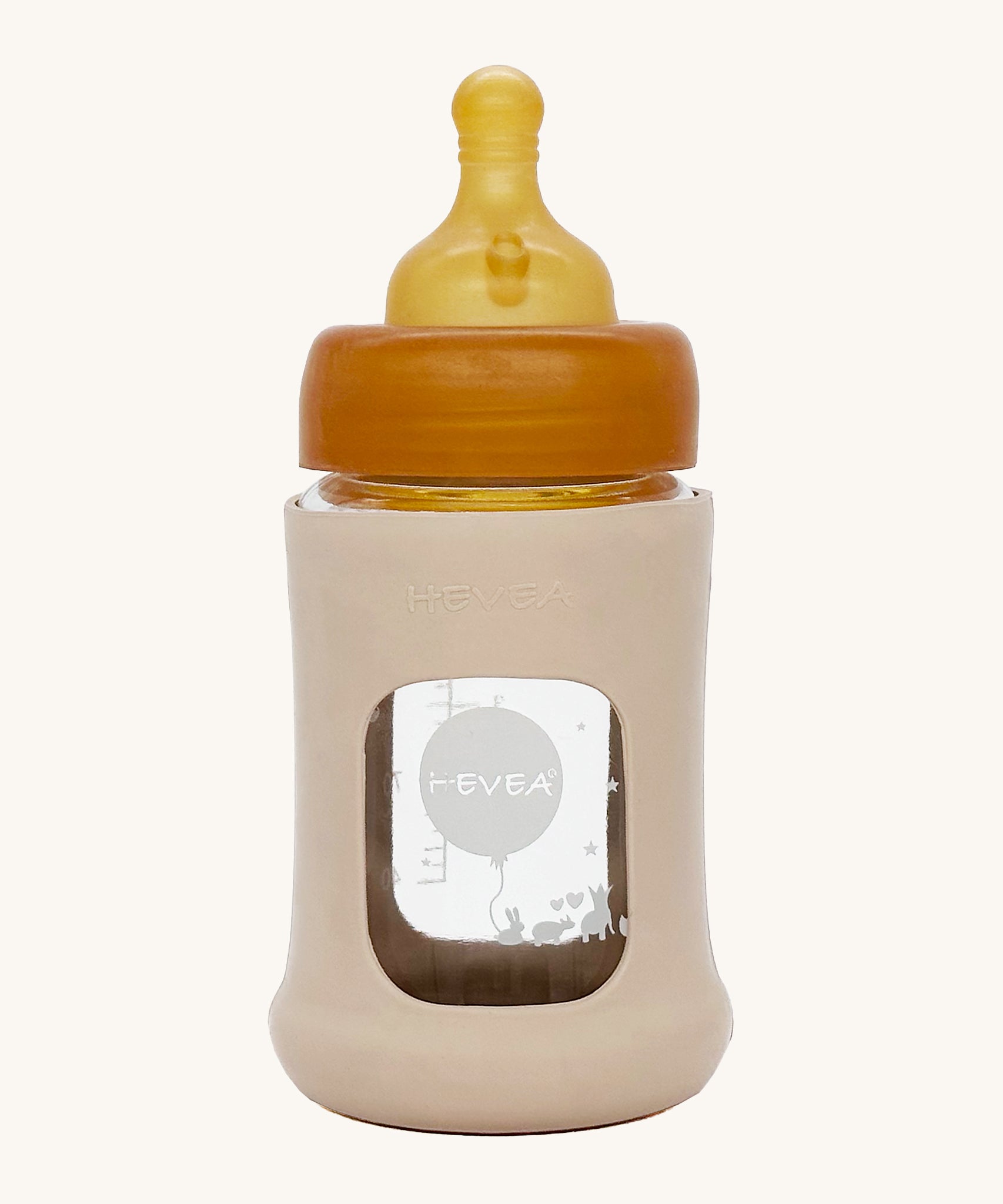 Hevea Glass Baby Bottle Wide Neck With Rubber Sleeve - 150ml in Sand on a taupe muslin blanket.