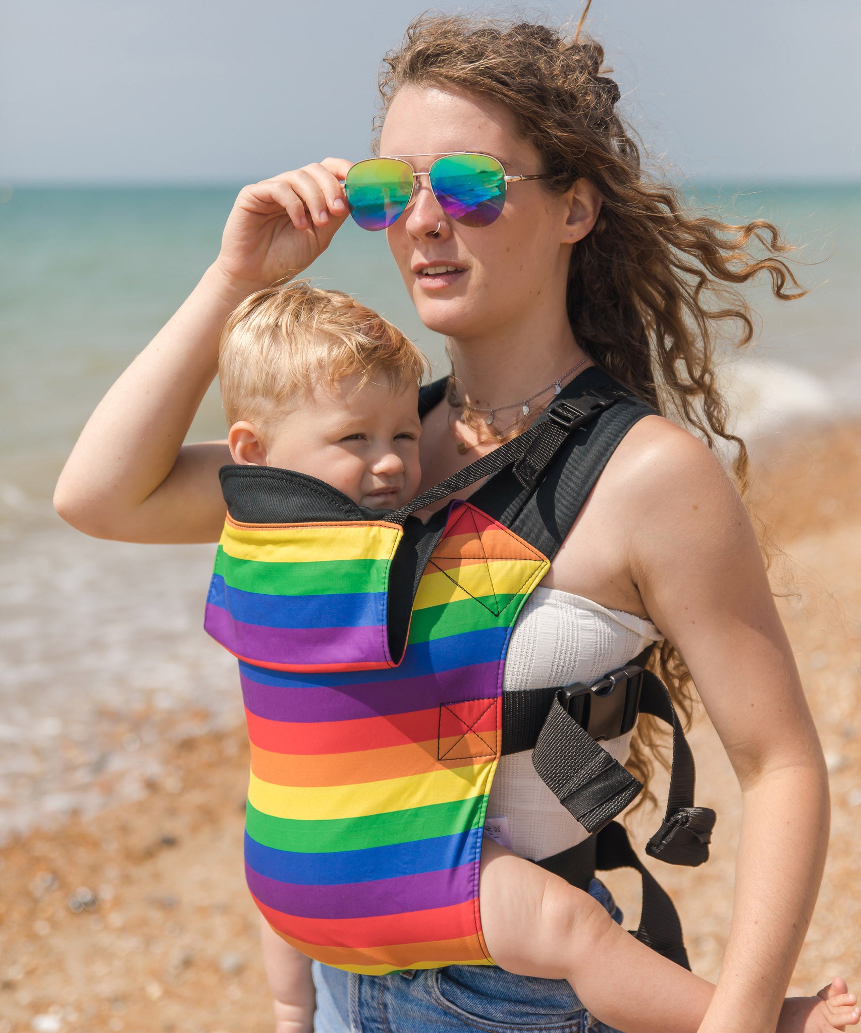 Integra rainbow baby carrier available at a Babipur a bold and bright rainbow inspired design carrier with a small hood for head protection.
