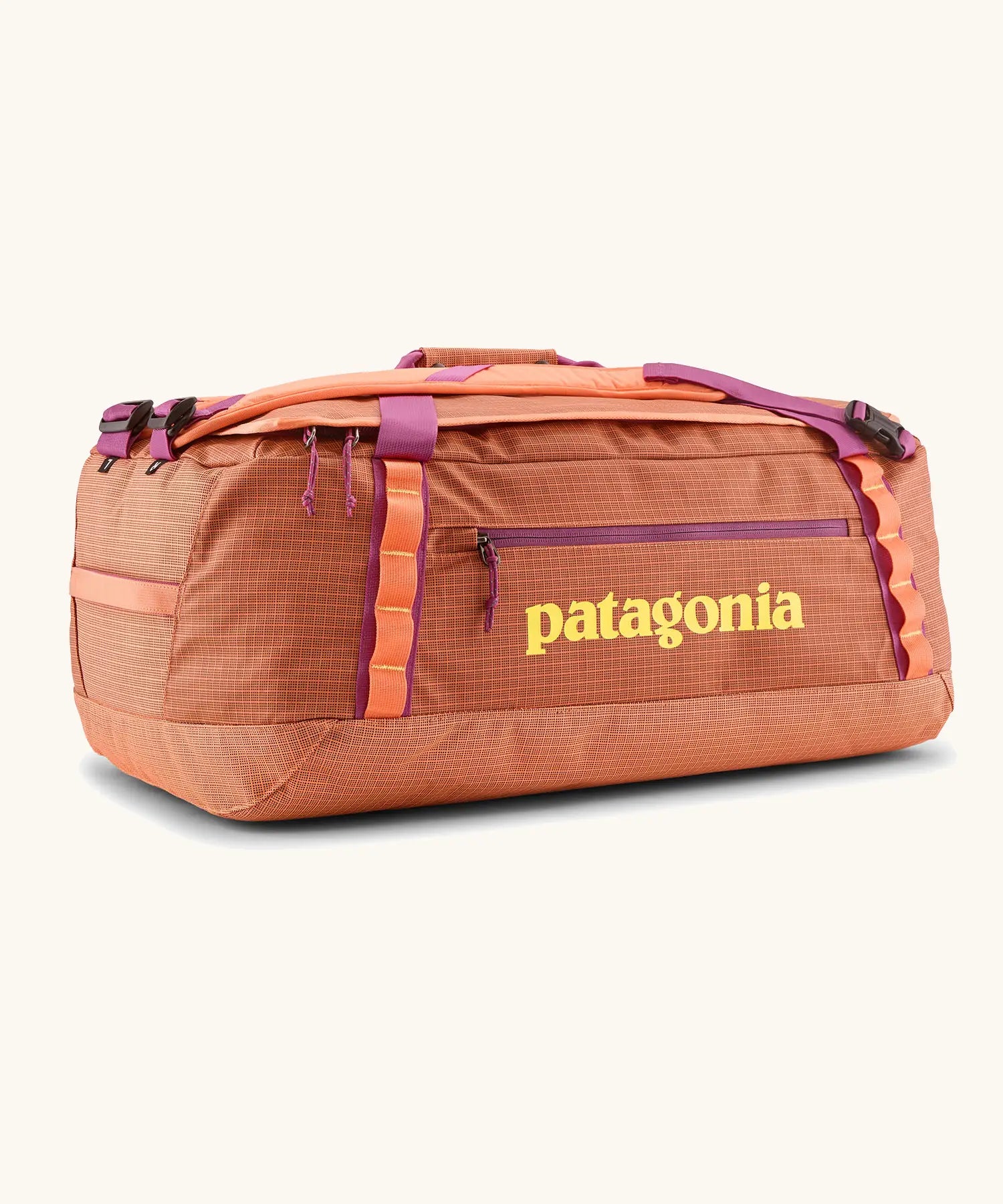 Patagonia black hole 55l duffel bag in bright orange with purple zip details, straps and yellow printed logo on front panel