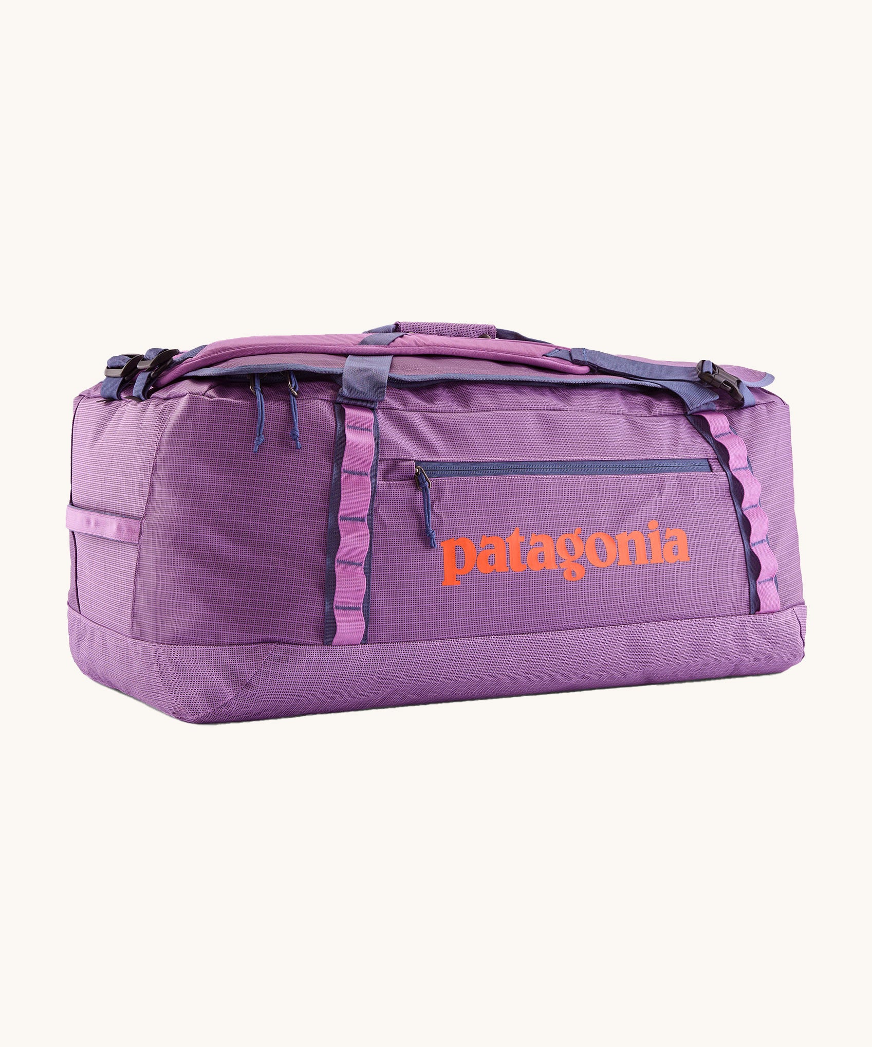 Patagonia black hole 70L duffel bag in brisk purple available at Babipur. A bright purple bag with orange branding on the side. Features shoulders straps and a handle on the top for easy carrying.