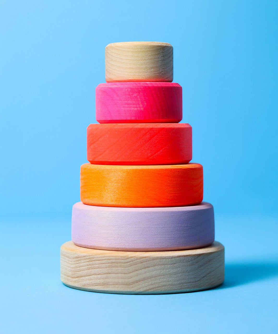 A modern Neon twist to a classic wooden toy, the Grimm's Small Neon Pink Conical Stacking Tower toy is made from warm natural wood with a dayglow pop of colour in neon pink, orange and purple shades.