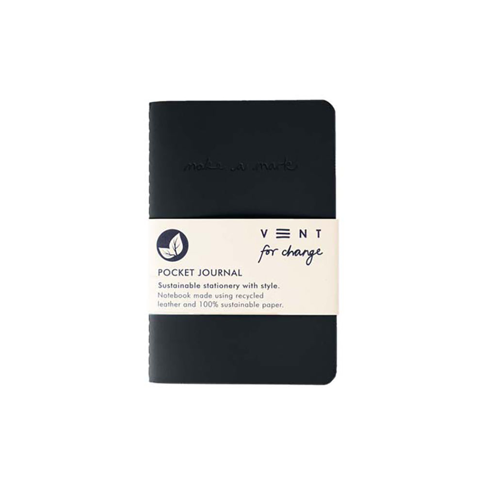 3 VENT for Change recycled leather pocket journals laid out on a white background