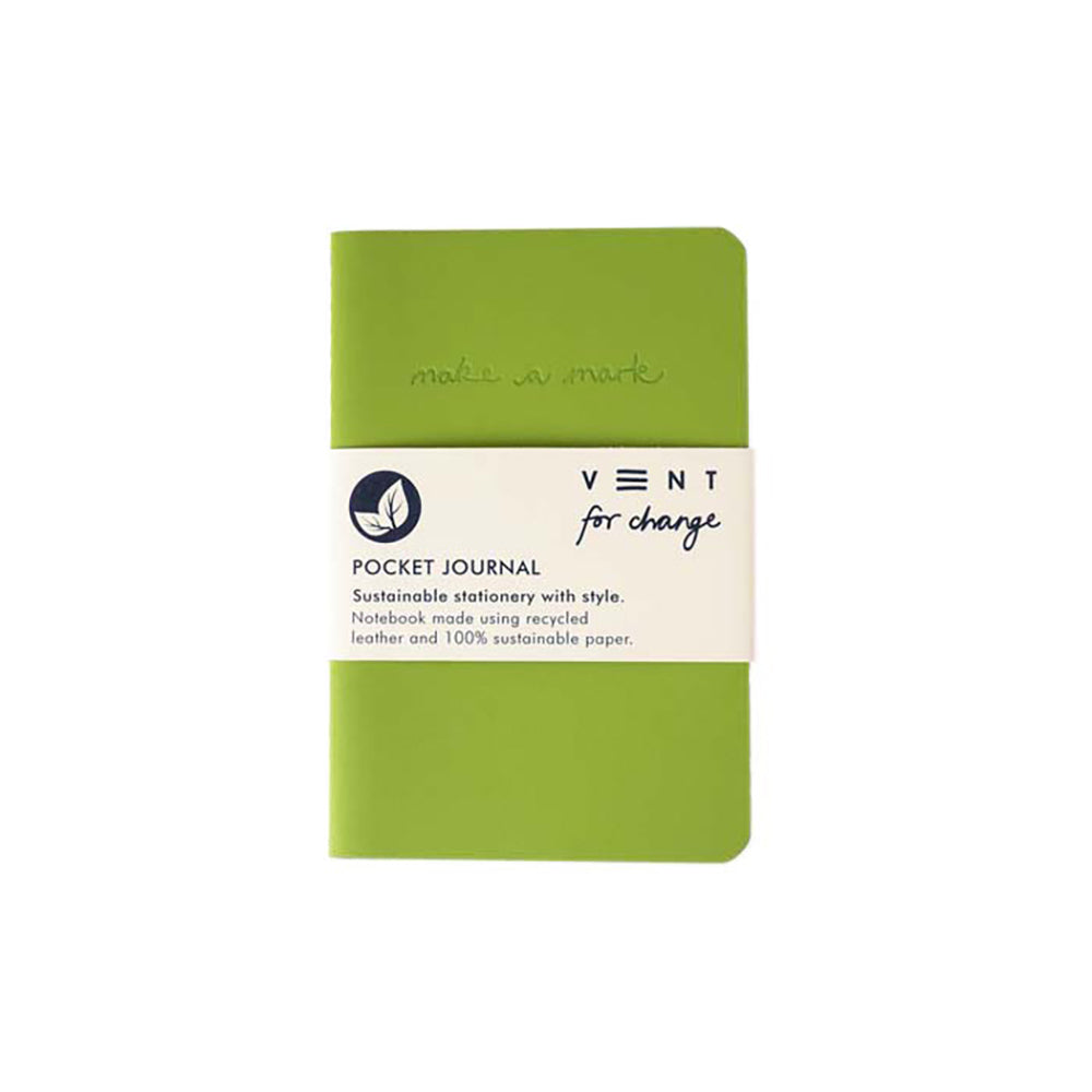 VENT for Change recycled leather pocket journal in green on a beige background next to a pencil and some lined paper