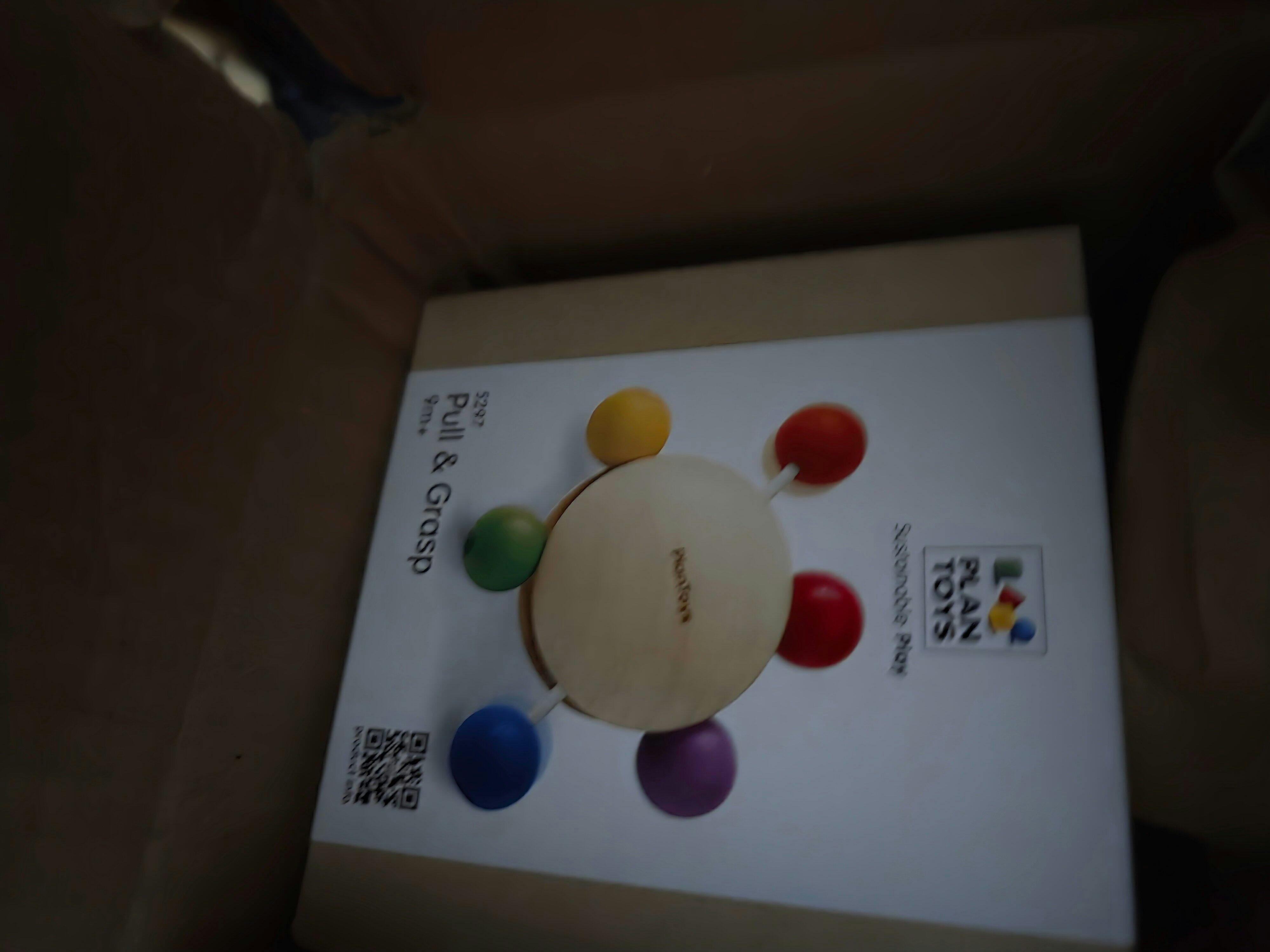 A baby grasping the Plan Toys Wooden Pull & Grasp Toy.