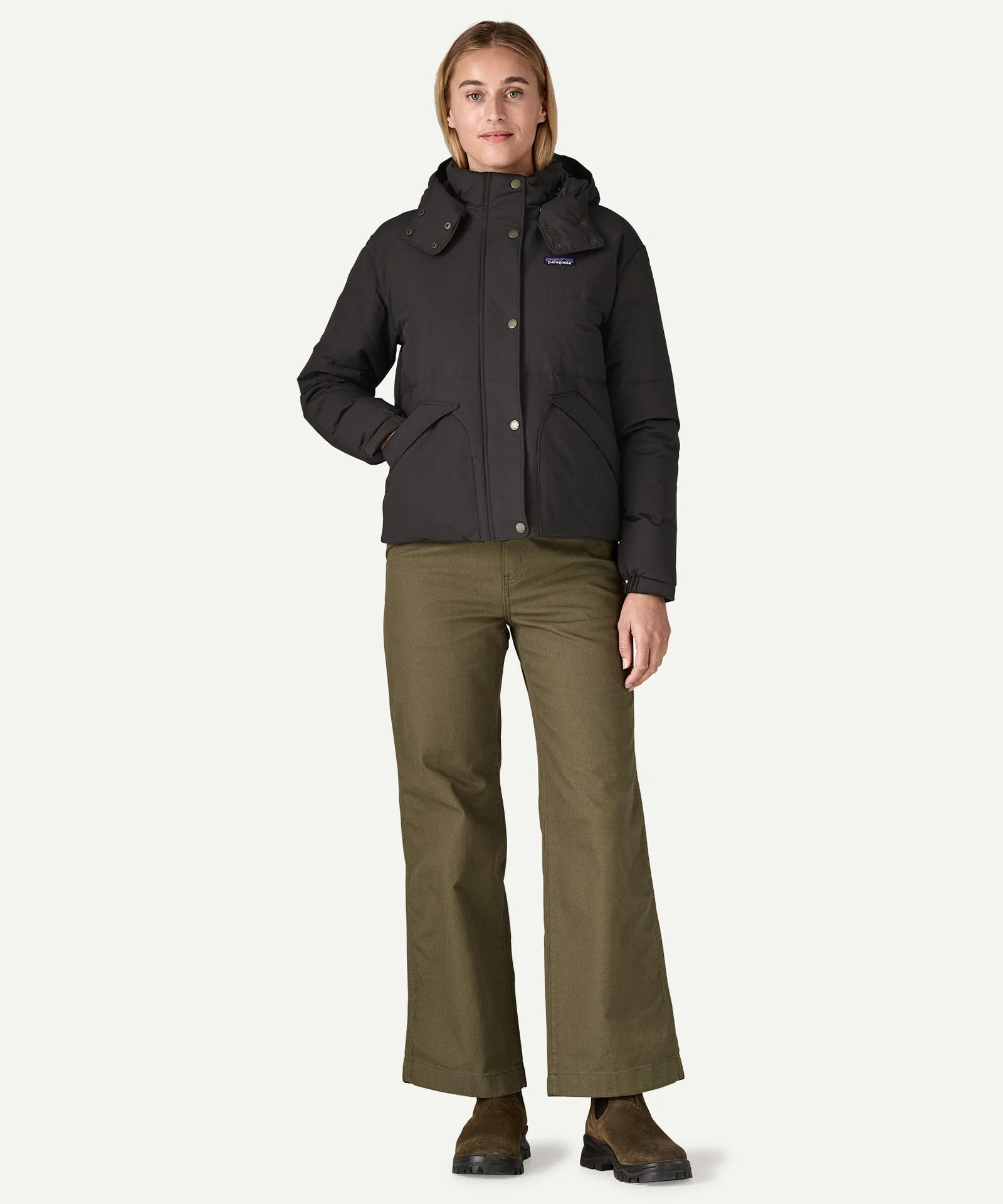 A woman wearing the Patagonia downdrift jacket in black, along with Patagonia cotton corduroy trousers.