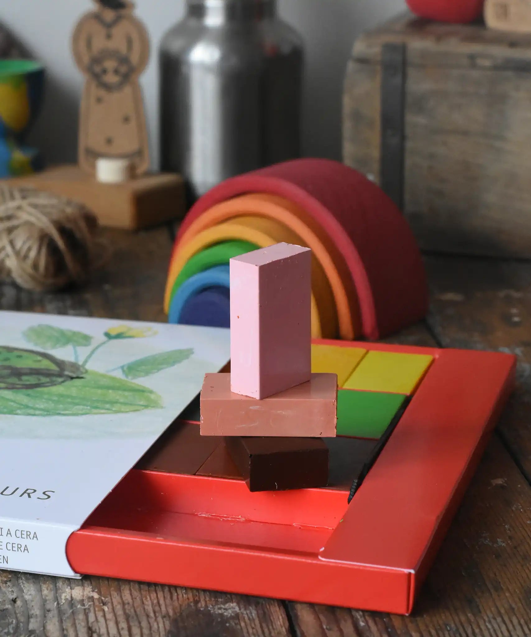 Opening the box reveals the natural, warm aroma of beeswax, a subtle sensory reminder of the material at the heart of each crayon. Arranged in a flowing spectrum, the colours support intuitive understanding of contrast, tone and harmony.