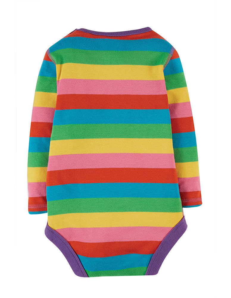 This Frugi Favourite Long Sleeve Body in Foxglove Rainbow Stripe is an organic cotton body suit for babies and children with a soft round neck and poppers at the shoulder in bright and colourful rainbow stripes and purple trim. This Frugi body can be warn on its own or as a layer in colder weather and looks great with comfy bottoms, dungarees, jeans and shorts from Babipur.